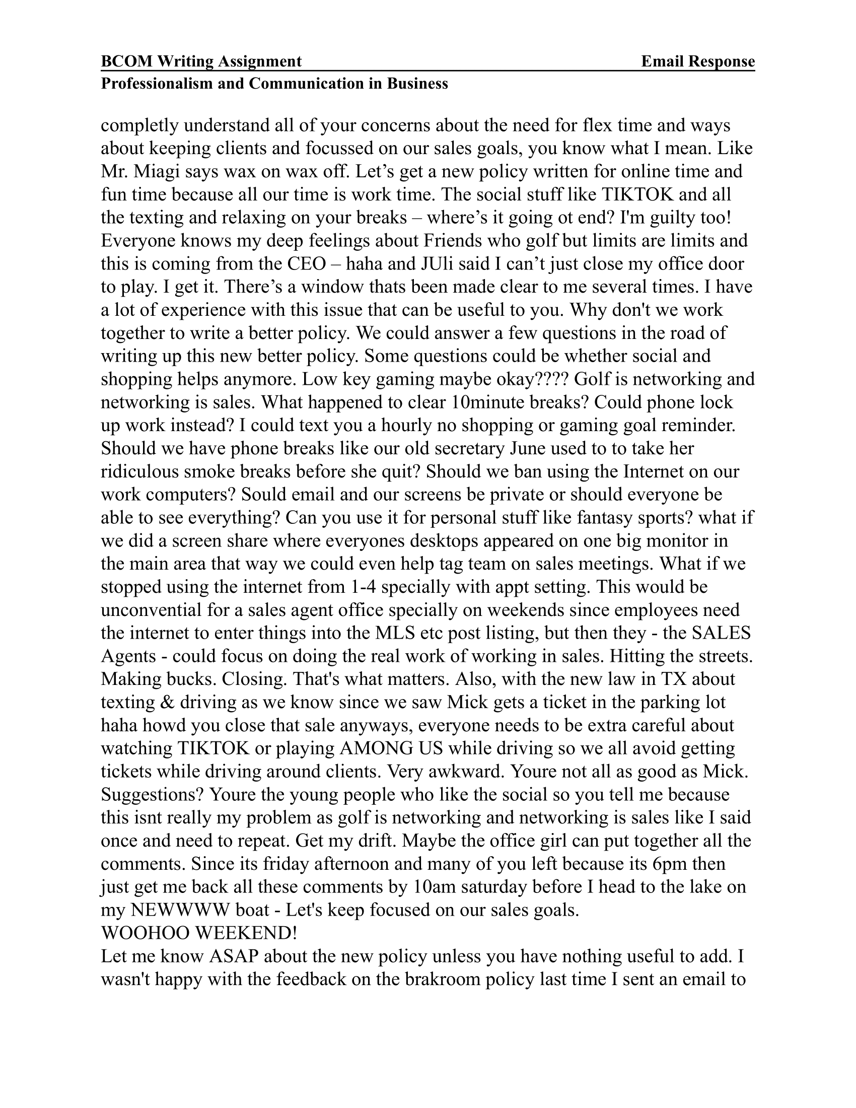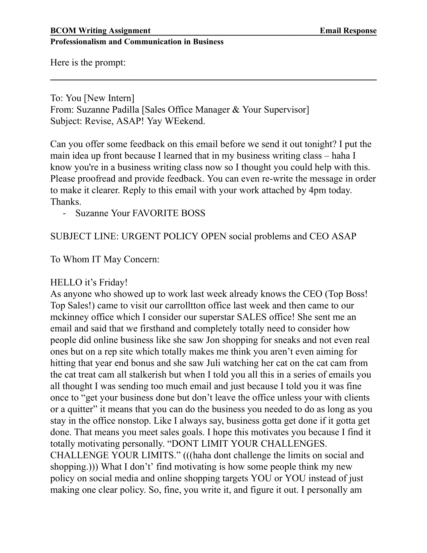 In my Business Communication class, I worked on projects focused on developing professional writing, public speaking, and data tracking skills. Below are a few examples of the projects I completed during the course.